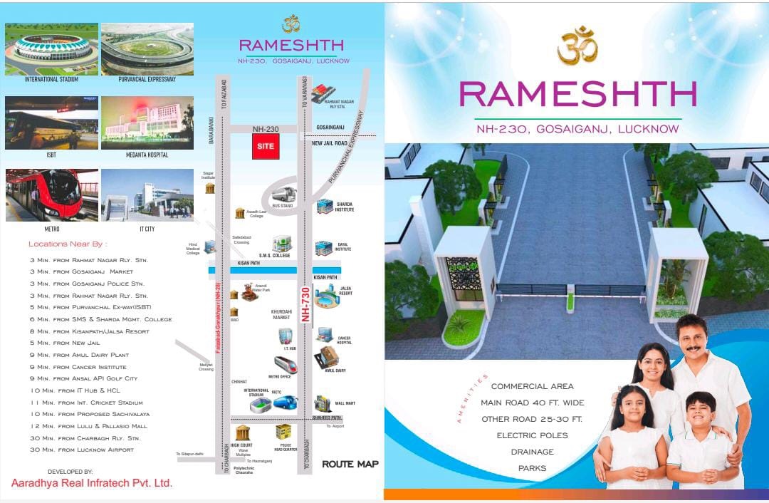 Rameshth At NH-230 Gosaiganj Lucknow is a premier real estate developmant project in Lucknow, which has launched an ambitious residential project. This project has been designd in such a way the each resident is guarented alife time of privacy and an unhurried pace of life with a completely safe, green and pollution free environment. In deed the property market in india real estate to habe not glimmered to the metro cities but to the capital of U.P has elevated to the coutry. Embraced of lush of greenery all around, signifies to experiance the simple joy of life. RAMESHTH is what modern living is all about.